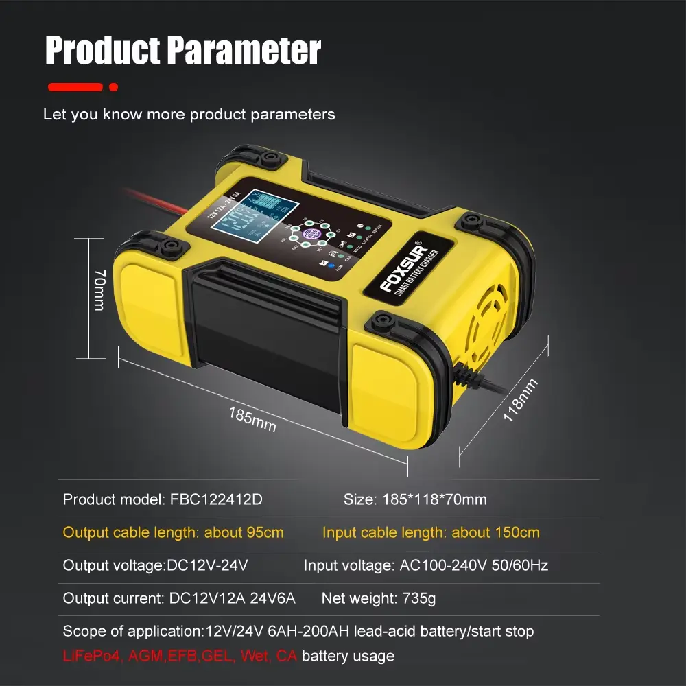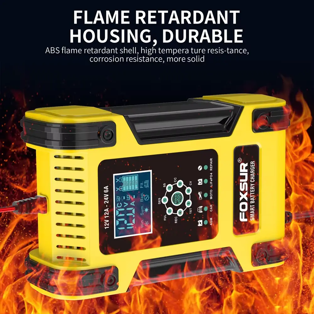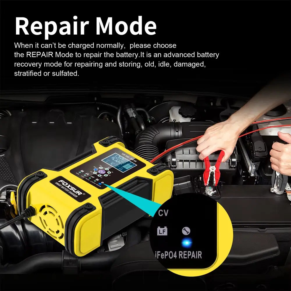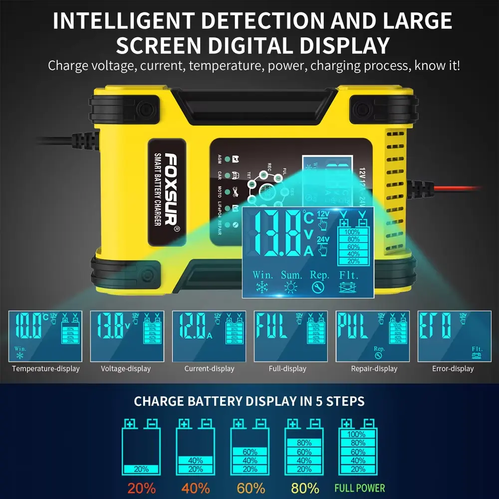 • ເຄື່ອງສາກ 7 ຂັ້ນຕອນແມ່ນເຫມາະສົມສໍາລັບປະເພດຫມໍ້ໄຟສ່ວນໃຫຍ່ລວມທັງ Calcium, Gel AGM, LiFePo4, Wet, lead Acid batteries. ພວກມັນອາດຈະຊ່ວຍຟື້ນຟູແບັດເຕີລີທີ່ລະບາຍນ້ຳ ແລະ ຊູນຟູດ.