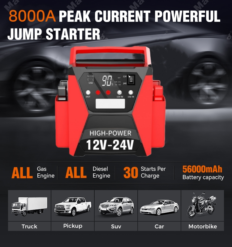 STARWELL ແນະນຳເຄື່ອງສາກແບັດເຕີລີອັດສະລິຍະ 12V/24V Car Jump Starter ປະສິດທິພາບສູງ, ເຄື່ອງປ່ຽນເກມສຳລັບເຈົ້າຂອງລົດທີ່ຊອກຫາຄວາມໜ້າເຊື່ອຖື ແລະ ສະຕິປັນຍາໃນການບຳລຸງຮັກສາແບັດເຕີຣີ ແລະ ການເລີ່ມຕົ້ນສຸກເສີນ. ມາພ້ອມກັບກະແສໄຟຟ້າສູງສຸດ 8000A ແລະກະແສເລີ່ມຕົ້ນ 4000A, ເຄື່ອງສາກແບດເຕີລີ່ອັດສະລິຍະສອງແຮງດັນນີ້ປະສົມປະສານພະລັງງານທີ່ເຂັ້ມແຂງກັບເຕັກໂນໂລຊີອັດສະລິຍະ, ເຮັດໃຫ້ມັນເຫມາະສົມສໍາລັບເຄື່ອງຈັກອາຍແກັສແລະເຄື່ອງຈັກກາຊວນທັງຫມົດເຖິງ 15L, ກວມເອົາລົດໃຫຍ່, ລົດບັນທຸກ, RVs, ລົດຈັກ, ເຮືອ, ແລະແມ້ກະທັ້ງຍານພາຫະນະການຄ້າທີ່ມີນ້ໍາຫນັກຫຼາຍ.