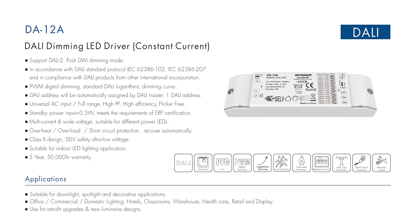ຄວາມເຂົ້າກັນໄດ້ແບບຍືດຫຍຸ່ນ: ປະຕິບັດຕາມ DALI-2, ສະຫນັບສະຫນູນ 64 ທີ່ຢູ່ເອກະລາດແລະ 16 ກຸ່ມ scene, ການເຊື່ອມໂຍງ seamless ກັບ BMS ແລະຕົວຄວບຄຸມພາກສ່ວນທີສາມ.
