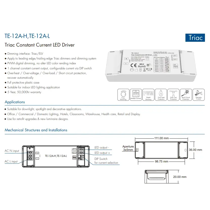 ຂະໜາດນ້ອຍ 12W Constant Current Triac Dimmable LED Driver