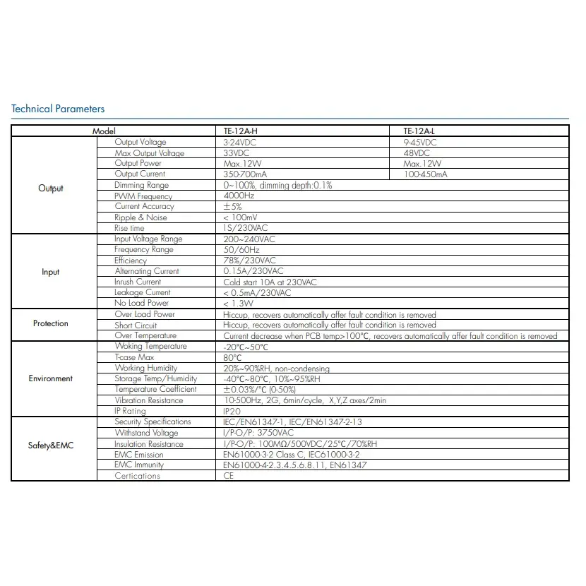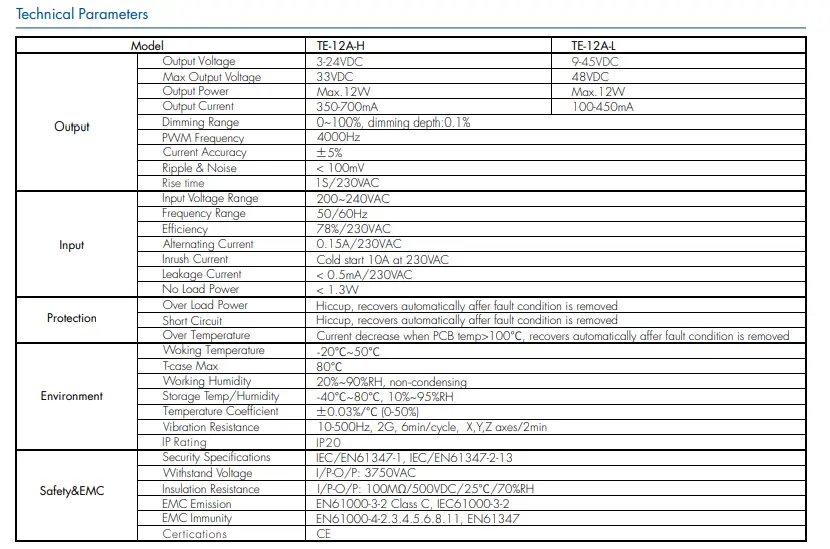 ແຮງດັນໄຟຟ້າເຂົ້າ: 200-240VAC 50-60Hz ກະແສໄຟຟ້າເຂົ້າ: 0.15A ກໍາລັງຜົນຜະລິດ: 12 ວັດສູງສຸດ ແຮງດັນຂາອອກ: 9 ~ 42V ການຮັບປະກັນ: 2 ປີ ໃບຢັ້ງຢືນ: CE / Rohs