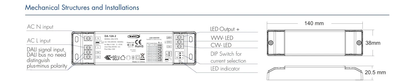 ຢູ່ໃນກໍລະນີ IP20 ທີ່ຫນາແຫນ້ນ, ໄດເວີ LED Dimmable ນີ້ເຮັດໃຫ້ການຕິດຕັ້ງງ່າຍເຖິງແມ່ນວ່າຢູ່ໃນສະຖານທີ່ຈໍາກັດເຊັ່ນໄຟ LED ຫຼືເຮືອນທີ່ມີການຕິດຕັ້ງ. ໂດຍການລວມເອົາຜົນຜະລິດຄົງທີ່ໃນປະຈຸບັນ, ການປັບແຕ່ງ CCT ຢ່າງກວ້າງຂວາງ, ແລະຄວາມເຂົ້າກັນໄດ້ຂອງ DALI-2 ມາດຕະຖານອຸດສາຫະກໍາ, ມັນເຮັດຫນ້າທີ່ເປັນຕົວຂັບທີ່ເຫມາະສົມແລະຫຼັກຖານໃນອະນາຄົດສໍາລັບໂຄມໄຟສີຂາວທີ່ສາມາດປັບໄດ້, ການຕິດຕັ້ງເສັ້ນ, ແລະແສງສະຖາປັດຕະຍະກໍາ - ປະສົມປະສານເຂົ້າໄປໃນລະບົບນິເວດແສງສະຫວ່າງສະຫຼາດທີ່ທັນສະໄຫມ.