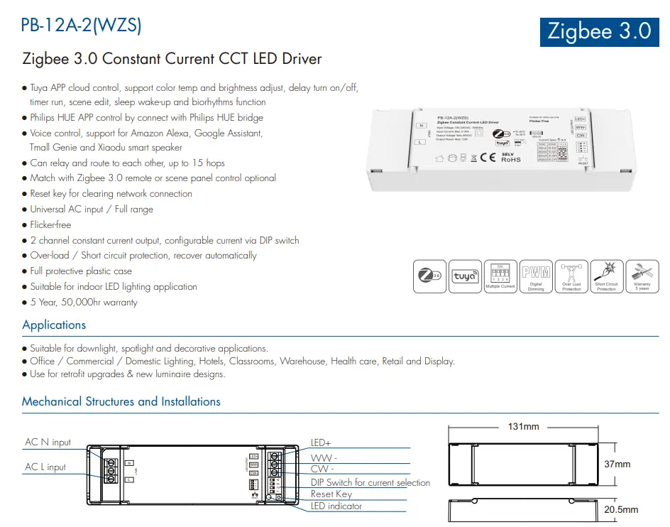 ຖືກອອກແບບມາສໍາລັບການໂຫຼດ LED ສູງສຸດ 12W, Zigbee 3.0 LED Driver ສະຫນອງຫນ້າທີ່ປົກປ້ອງຄວາມປອດໄພຢ່າງສົມບູນ. ຜົນຜະລິດທີ່ຫມັ້ນຄົງແລະການສື່ສານໄຮ້ສາຍທີ່ເຊື່ອຖືໄດ້ເຮັດໃຫ້ມັນເຫມາະສົມສໍາລັບໂຄງການເຮັດໃຫ້ມີແສງ smart indoor ຕ່າງໆທີ່ມີຄວາມຫມັ້ນຄົງໃນໄລຍະຍາວ.