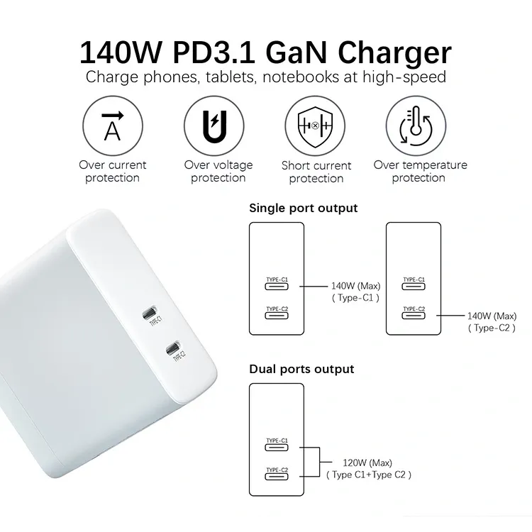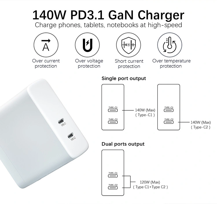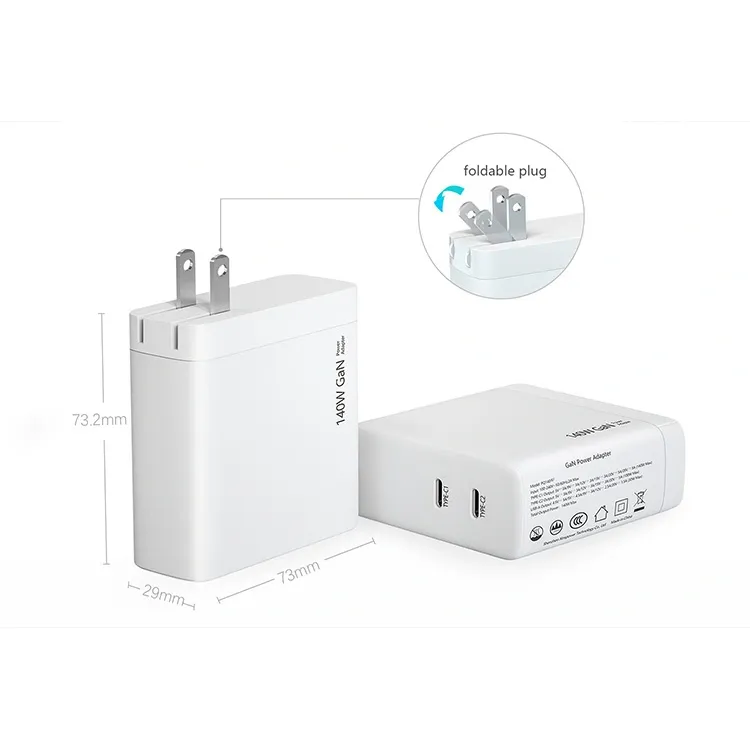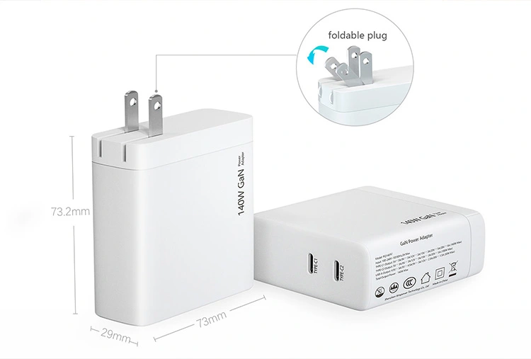 140W ຄູ່ USB C PT PD PD PD PLUT ສຽບທີ່ພັບໄດ້: ພອດດຽວສາມາດສະຫນອງພະລັງງານໄດ້ເຖິງ 140W. ອໍານາດຜົນຜະລິດທີ່ຜະລິດຕະພັນອອກສອງດ້ານແມ່ນຖືກຈັດສັນຢ່າງສະຫຼາດພ້ອມໆກັນ. ເມື່ອສາກໄຟຄອມພິວເຕີແລັບທັອບແລະໂທລະສັບມືຖືພ້ອມໆກັນ, ປະສິດທິພາບຍັງຄົງບໍ່ປ່ຽນແປງ.