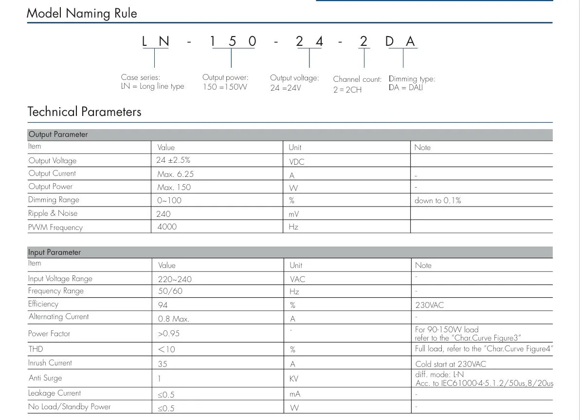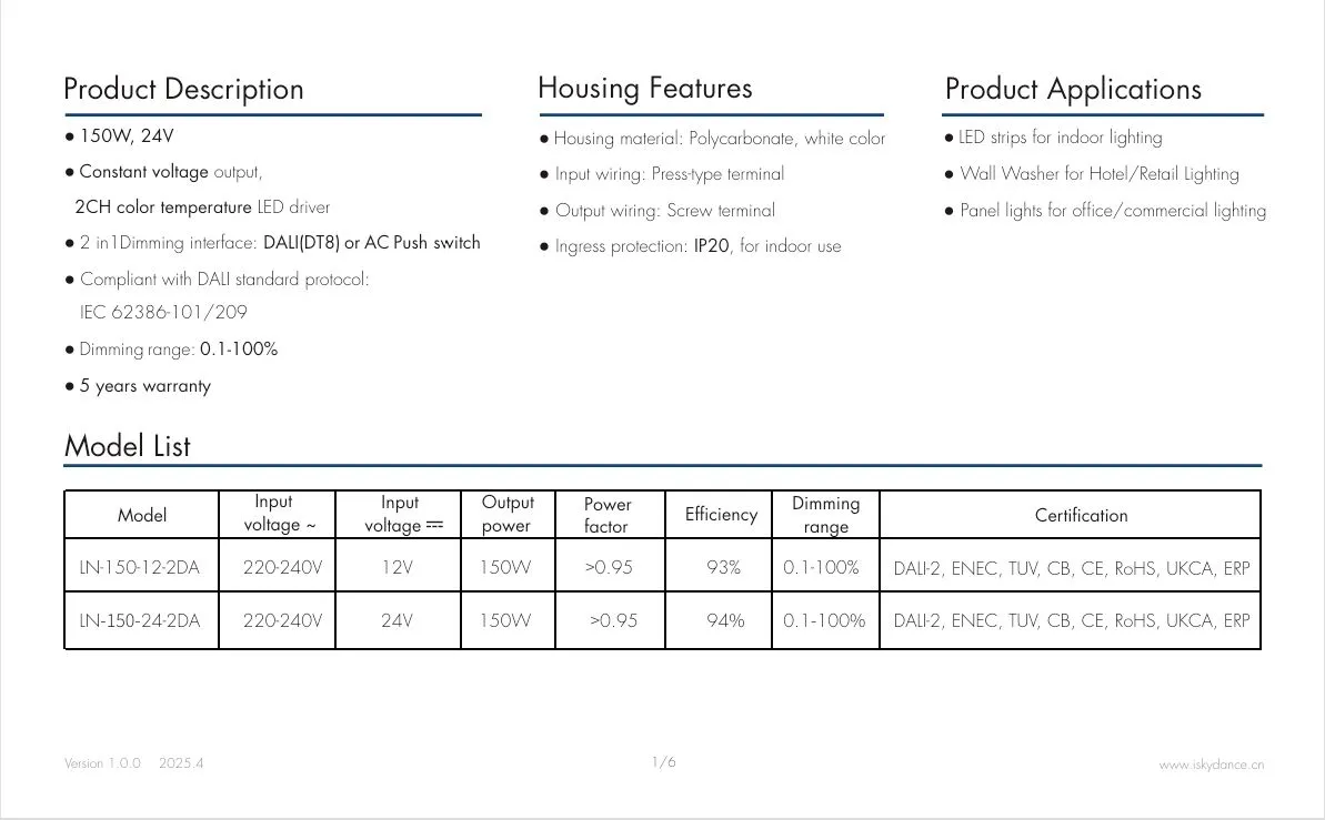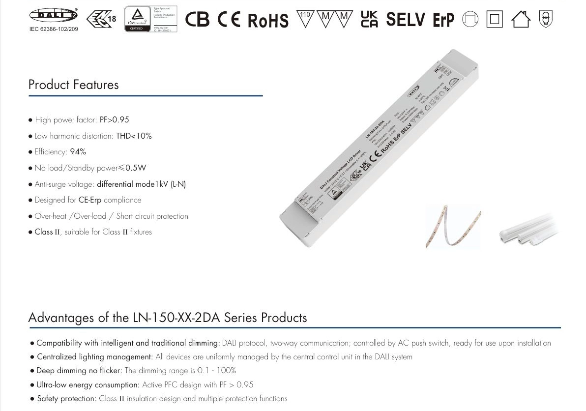ການຂາຍຮ້ອນຂອງໂຮງງານ Starwell 150W 24V DALI CCT Constant Voltage LED Driver ສະຫນັບສະຫນູນການປັບອຸນຫະພູມສີສອງ DALI CCT ເອກະລາດ, ເຮັດໃຫ້ການຄວບຄຸມຄວາມສະຫວ່າງແລະອຸນຫະພູມສີທີ່ຊັດເຈນເພື່ອຕອບສະຫນອງຄວາມຕ້ອງການແສງສະຫວ່າງທີ່ຫຼາກຫຼາຍ. ຜະລິດຕະພັນມີປະສິດຕິພາບສູງ 91%, ປັດໄຈພະລັງງານ (PF) > 0.95, ການບິດເບືອນປະສົມກົມກຽວຕ່ໍາ (THD) < 10%, ແລະການບໍລິໂພກພະລັງງານສະແຕນບາຍຕ່ໍາສຸດ (≤ 0.5W), ຕອບສະຫນອງມາດຕະຖານປະສິດທິພາບພະລັງງານ CE-Erp.