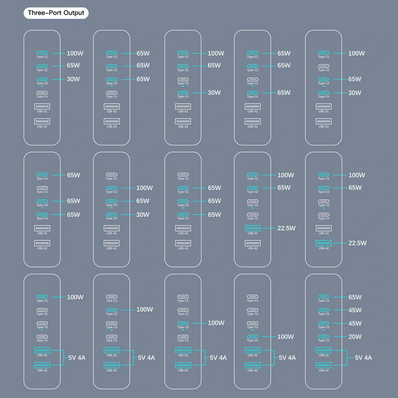 ຜົນໄດ້ຮັບ USB C1 / C3 / C4 / C4: 5V / 3A 9V / 3A 12V / 3A 15V / 3A 20A 20A 20A 20A / 5A / 5A) USB A1 / A2: 5V / 3A 9A 9V / 2A 12A / 1.5A (18 ຫຼັກ) |