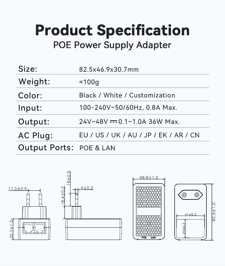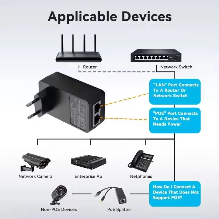 ໂຮງງານ STARWELL 24V 1A ສຽບປລັກ EU Plug POE Injector ປະກອບດ້ວຍອິນພຸດ AC ທົ່ວໄປ (100-240V) ທີ່ມີຜົນຜະລິດທີ່ເລືອກໄດ້: 24V/0.5A, 24V/1A, ຫຼື 48V/0.5A. ມັນຮອງຮັບທັງໂປຣໂຕຄອນ Passive ແລະ Active PoE, ດ້ວຍການມອບໝາຍ pin ທີ່ມີຄວາມຍືດຫຍຸ່ນລວມທັງ Midspan (4,5+/7,8-) ແລະ Endspan (1,2+/3,6-). ປະຕິບັດຕາມມາດຕະຖານ IEEE802.3af/at/bt PoE++ ຢ່າງສົມບູນ, ມັນສະຫນອງຄວາມສາມາດຄວາມໄວຂໍ້ມູນພິເສດຕັ້ງແຕ່ 10/100/1000M ຫາ 2.5G/5G/10G bps.