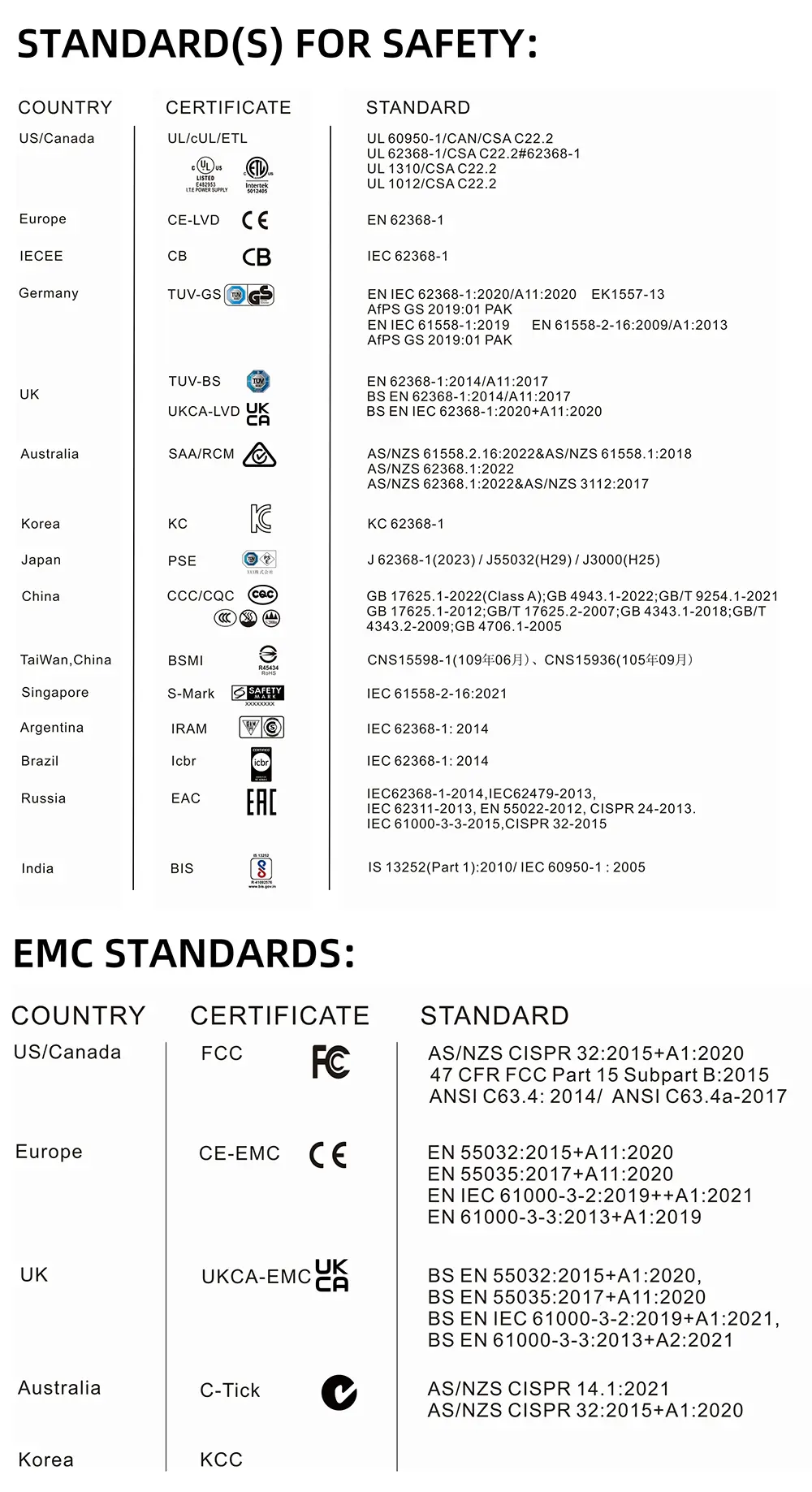 ຄວາມປອດໄພຂອງທ່ານແມ່ນສໍາຄັນທີ່ສຸດ. ອະແດບເຕີນີ້ຖືກອອກແບບແລະຜະລິດເພື່ອຕອບສະຫນອງມາດຕະຖານສາກົນທີ່ເຄັ່ງຄັດ, ຮັບປະກັນບໍ່ພຽງແຕ່ປະສິດທິພາບທີ່ຫນ້າເຊື່ອຖື, ແຕ່ຍັງຄວາມສະຫງົບຂອງຈິດໃຈ. ມັນສອດຄ່ອງກັບ ETL CE FCC TUV GS CB PSE KC KCC BIS SAA RCM c-Tick CCC UKCA UL cUL RoHS , ເຊິ່ງຄວບຄຸມຄວາມປອດໄພ, ສຸຂະພາບ, ແລະການປົກປ້ອງສິ່ງແວດລ້ອມ.