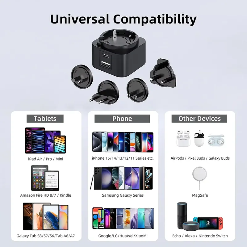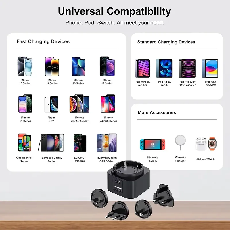 versatility ແມ່ນກຸນແຈ. ການອອກແບບ Dual-Port-Port (USB-C / USB-A) ຊ່ວຍໃຫ້ທ່ານສາມາດສາກໄຟໄດ້ສອງອຸປະກອນພ້ອມໆກັນ. 30W ເຄື່ອງສາກໄຟສາມາດແລກປ່ຽນໄດ້ 30W ມີຊຸດຂອງປັ apun າທີ່ສາມາດແລກປ່ຽນໄດ້ (ສະຫະລັດ / EU / ອັງກິດ / ອັງກິດ), ເຮັດໃຫ້ມີການເດີນທາງທີ່ສົມບູນແບບຂອງທ່ານທົ່ວໂລກ. ບໍ່ວ່າທ່ານຈະຄິດຄ່າໂທລະສັບສະມາດໂຟນ, ແທັບເລັດ, ຫລືຄອມພິວເຕີ, ຄວາມເຂົ້າກັນໄດ້ຮັບປະກັນການປະຕິບັດດ້ານເທິງ Top-Tool.