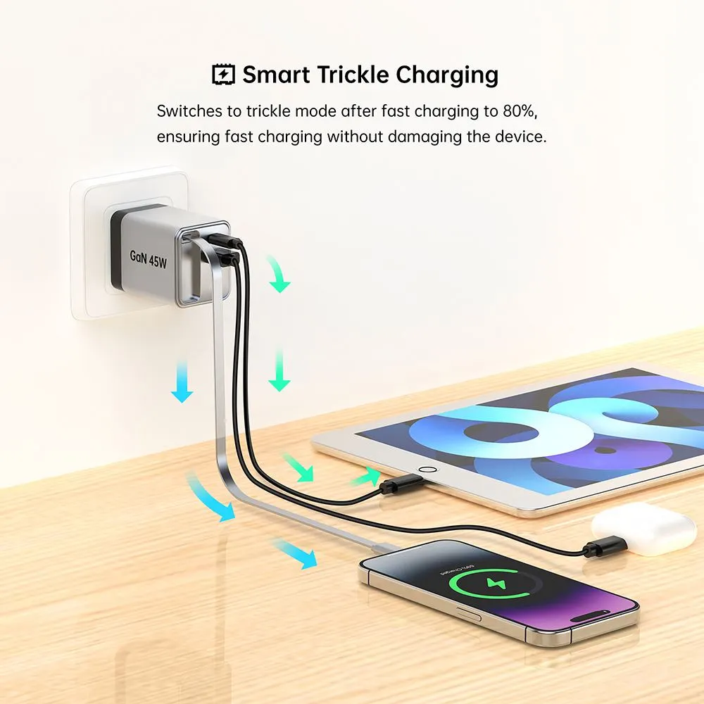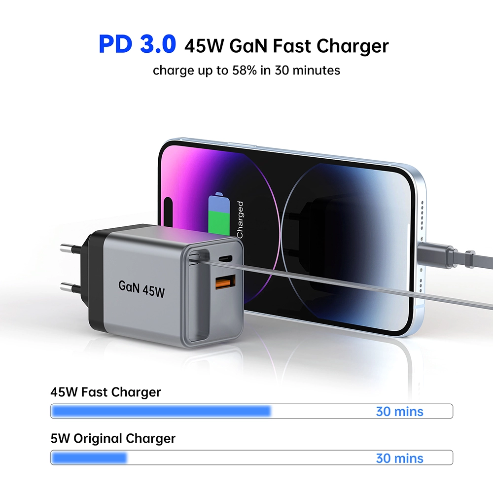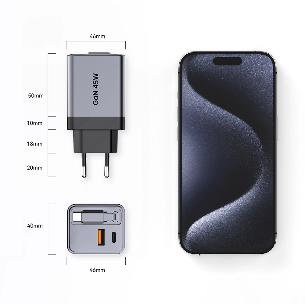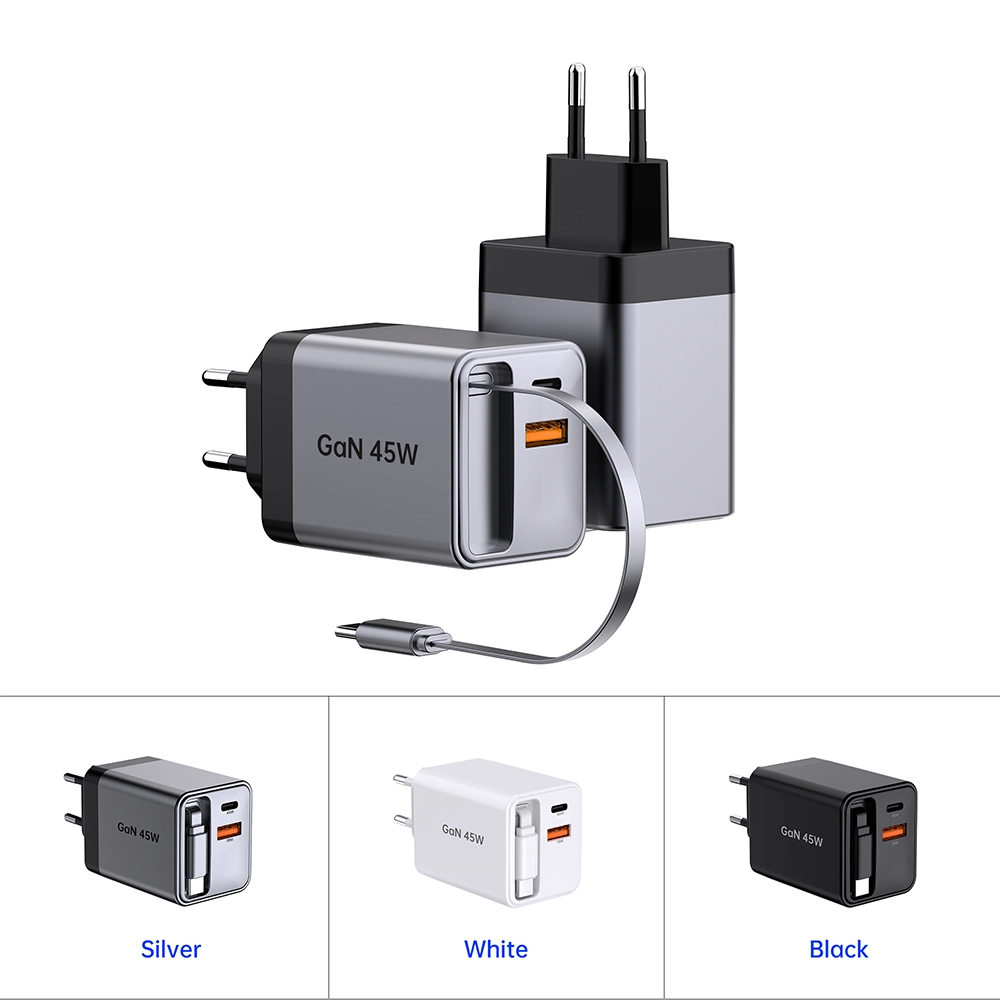 ສາກໄຟຄວາມໄວສູງ: Gan 45W Retactable Charractable Fast Charractable ມີຜົນຜະລິດທີ່ມີປະສິດທິພາບຂອງ 45 ວັດ, ຮັບປະກັນການສາກໄຟແບບໄວສໍາລັບອຸປະກອນຂອງທ່ານ.