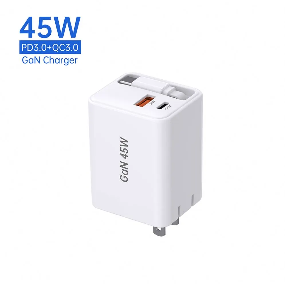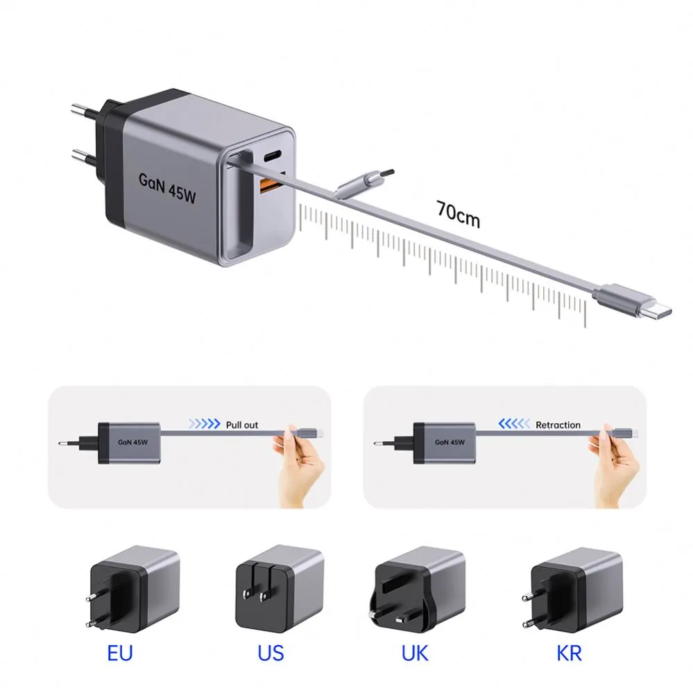 Gan 45W Retactable Charrager Cable usb-usb-usb-usb-us usb-C-usb-C 45 -5W PD Charger ດ້ວຍສາຍໄຟ