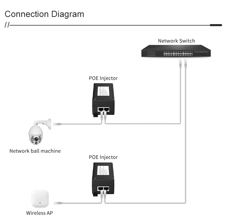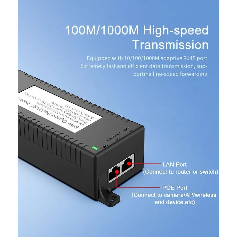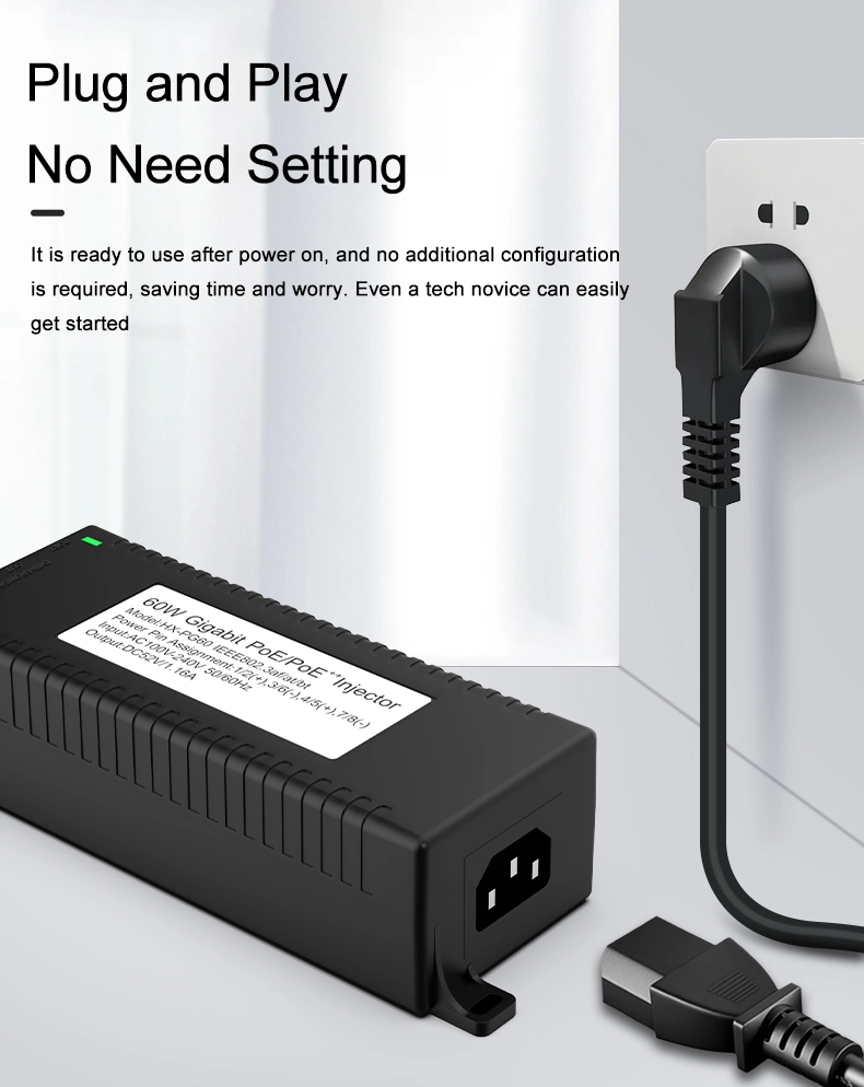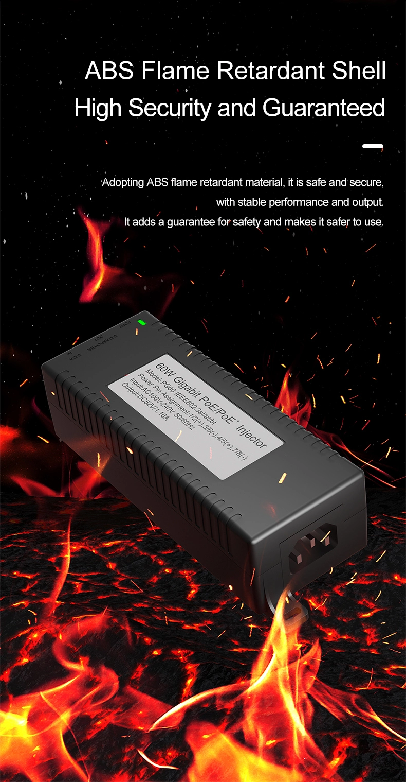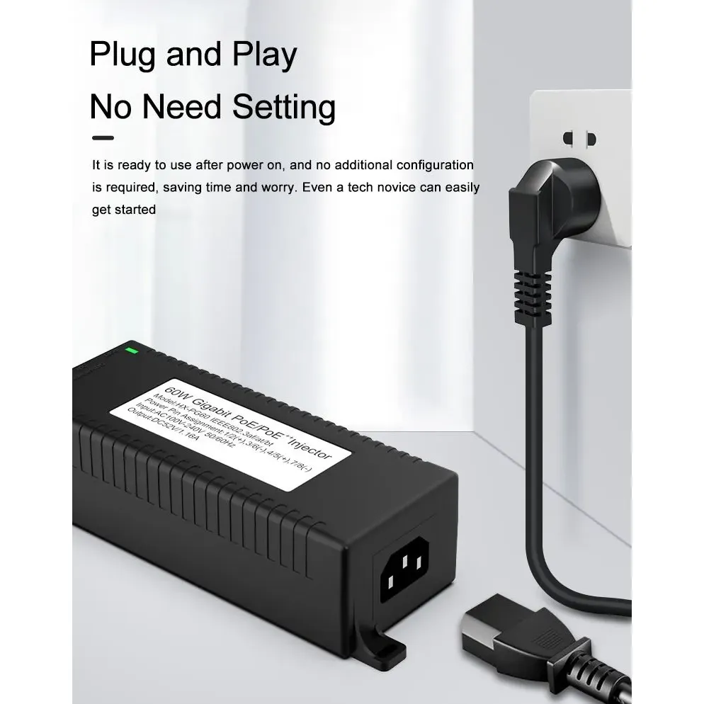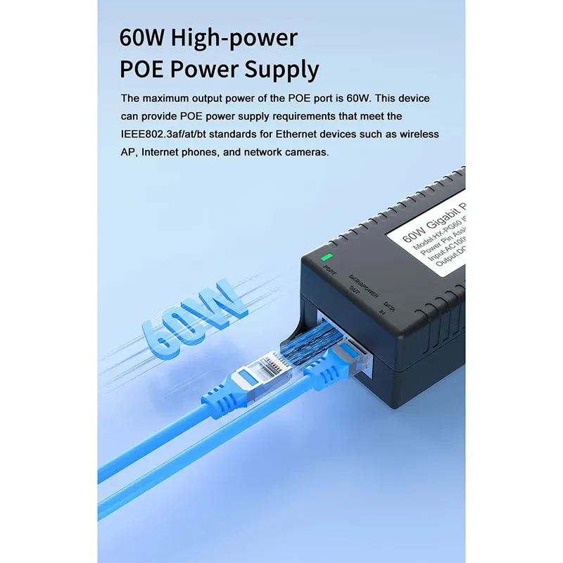 ການເຝົ້າລະວັງຄວາມປອດໄພ: Gigabit 60W desktop POE injector ສໍາລັບຄວາມປອດໄພກ້ອງຖ່າຍຮູບ IP ແລະອຸປະກອນເຄືອຂ່າຍ ໃຫ້ພະລັງງານທີ່ຫມັ້ນຄົງກັບກ້ອງຖ່າຍຮູບ IP ແລະກ້ອງຖ່າຍຮູບ PTZ.