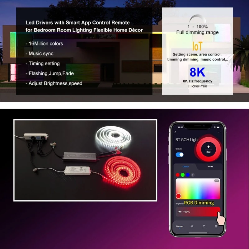Smart Dimming ຢູ່ປາຍນິ້ວມືຂອງທ່ານ ປະກອບດ້ວຍໂມດູນໄຮ້ສາຍ ZigBee ປະສົມປະສານກັບເທກໂນໂລຍີ TUYA, ໄດເວີນີ້ສະຫນອງການຄວບຄຸມອັດສະລິຍະທີ່ບໍ່ມີຮອຍຕໍ່. ປັບຄວາມສະຫວ່າງຜ່ານແອັບມືຖື ຫຼືຄຳສັ່ງສຽງຜ່ານ Google Home ແລະ Amazon Echo. ຄວາມຖີ່ສູງ 8K Hz PWM ຜົນຜະລິດຮັບປະກັນການ dimming ໂດຍບໍ່ມີການ flicker ຢ່າງສົມບູນ, ໃນຂະນະທີ່ໄລຍະ dimming 1-100% ທີ່ມີຄວາມເລິກ 1% ອະນຸຍາດໃຫ້ມີການປ່ຽນແປງທີ່ລຽບງ່າຍແລະສ້າງບັນຍາກາດທີ່ສົມບູນແບບ.