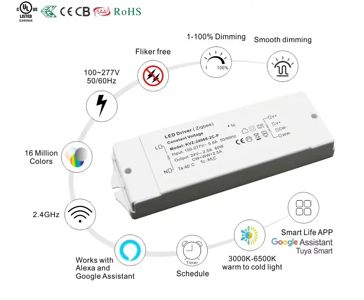 ປະສົບການການຜະສົມຜະສານທີ່ສົມບູນແບບຂອງການເຊື່ອມຕໍ່ອັດສະລິຍະ, ການຄວບຄຸມທີ່ຊັດເຈນ, ແລະປະສິດທິພາບທີ່ເຊື່ອຖືໄດ້ດ້ວຍໄດເວີ 60W ZigBee TUYA ຂອງພວກເຮົາ.