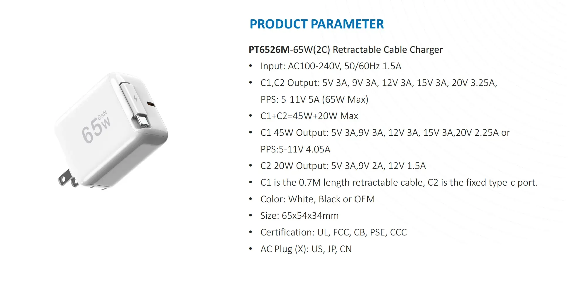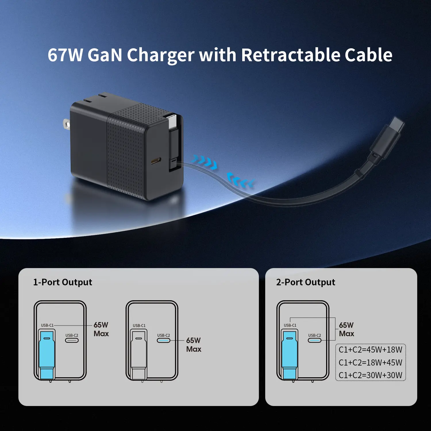 Ports ຄູ່ USB-C: The 65W PD 3.0 ສາກໄຟສາມາດສາກໄຟໄດ້ສອງອຸປະກອນພ້ອມໆກັນ. ໃນລະຫວ່າງຂັ້ນຕອນການສາກໄຟສອງຢ່າງ, ພະລັງງານແມ່ນຈັດສັນເປັນ 45W ແລະ 20W.
