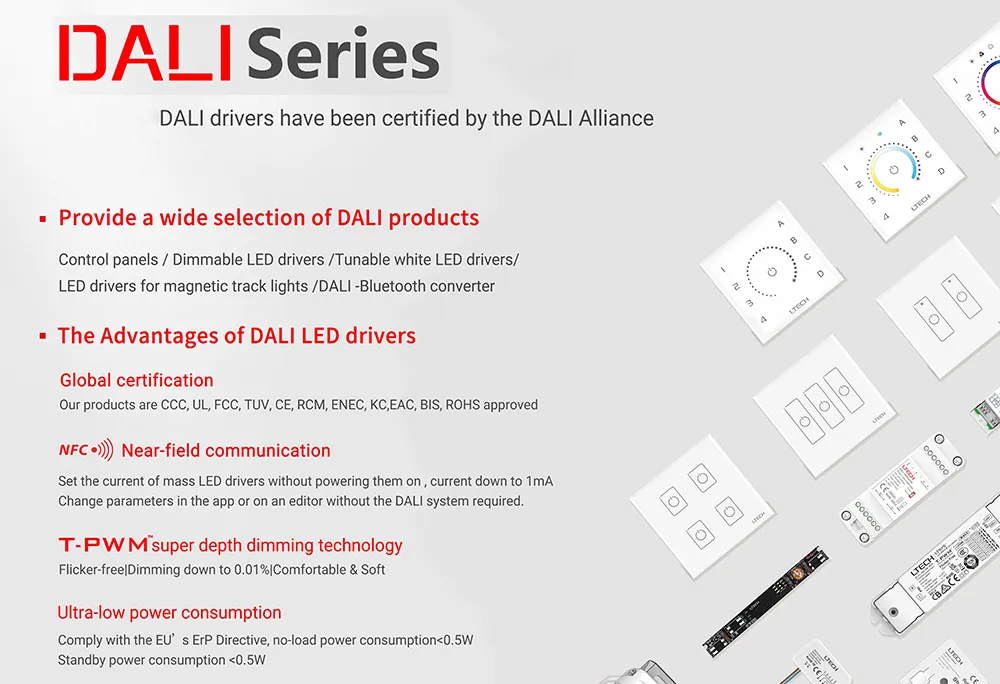 Advanced DALI Dimming Control - ເປີດໃຊ້ການຫຼຸດແສງດິຈິຕອນຈາກ 0.1% ຫາ 100% ດ້ວຍຄວາມລະອຽດສູງ, ຮອງຮັບໄດ້ເຖິງ 64 ທີ່ຢູ່ DALI ສໍາລັບການຄວບຄຸມບຸກຄົນ ຫຼືກຸ່ມໃນລະບົບໄຟອັດຕະໂນມັດ.