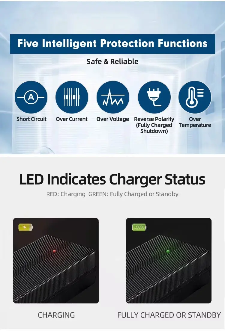 ຄວາມເຂົ້າກັນໄດ້ທົ່ວໂລກ & ຄວາມປອດໄພທີ່ເຂັ້ມແຂງ: ໂດຍມີອິນພຸດ 100–240VAC ທົ່ວໄປ, ມັນເຮັດວຽກທົ່ວໂລກຢ່າງບໍ່ຢຸດຢັ້ງ. ການສາກໄຟອັດສະລິຍະສາມຂັ້ນຕອນຂັ້ນສູງ (CC/CV) ປັບປຸງສຸຂະພາບຂອງແບດເຕີຣີໃນຂະນະທີ່ມີການປົກປ້ອງທີ່ສົມບູນແບບ - ລວມທັງວົງຈອນສັ້ນ, ແຮງດັນໄຟຟ້າເກີນ, ອຸນຫະພູມເກີນ, ແລະການໂຫຼດເກີນ - ຮັບປະກັນການດໍາເນີນງານທີ່ປອດໄພ, ບໍ່ມີຄວາມກັງວົນ. ທີ່ຢູ່ອາໄສທີ່ທົນທານແມ່ນກໍ່ສ້າງດ້ວຍວັດສະດຸທີ່ທົນທານຕໍ່ໄຟເພື່ອຄວາມຫນ້າເຊື່ອຖືທີ່ເພີ່ມຂຶ້ນໃນສະພາບແວດລ້ອມທີ່ຕ້ອງການ.