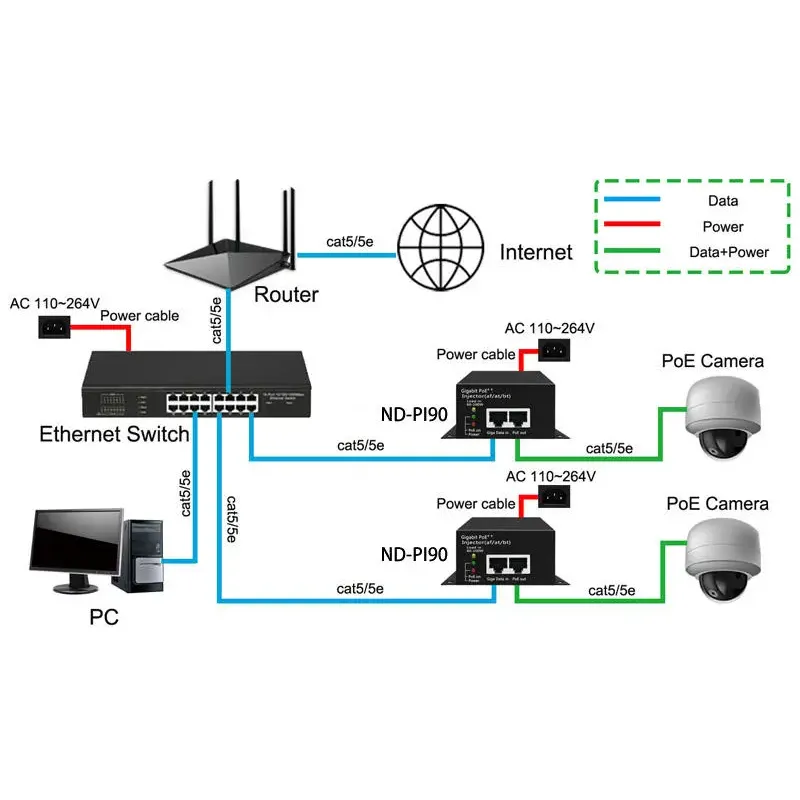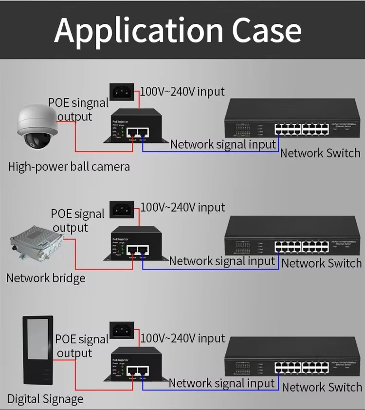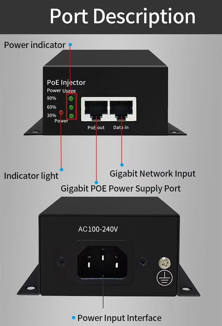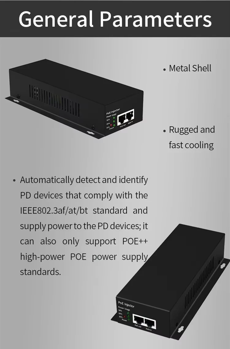 * ສອດຄ້ອງກັບ IEEE802.3bt ມາດຕະຖານການຈັດປະເພດໂປຣໂຕຄໍຊັ້ນ 8. * ຫຼຸດຜ່ອນຄວາມຕ້ອງການສໍາລັບອະແດບເຕີໄຟຟ້າແລະສາຍໄຟທີ່ມີຂະຫນາດໃຫຍ່, ແລະຄ່າໃຊ້ຈ່າຍໃນສາຍໄຟຕ່ໍາ. * ແຮງດັນໄຟຟ້າ AC ກວ້າງ 100-240V. * ຮອງຮັບແບນວິດເຄືອຂ່າຍ 10/100/1000Mbps.