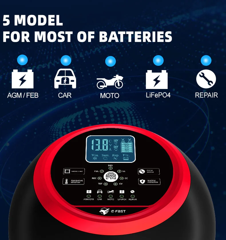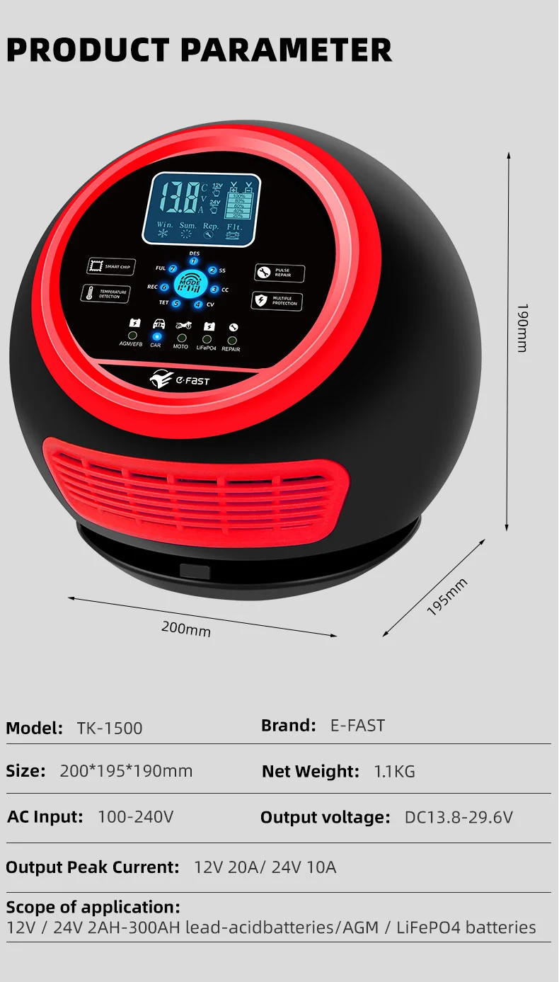 TK-1500 ເປັນເຄື່ອງສາກແບັດເຕີລີອັດຕະໂນມັດເຕັມທີ່ທີ່ມີປະສິດທິພາບ, ມີສອງໂຫມດການສາກໄຟ: 12V/20A ແລະ 24V/10A. ມັນໄດ້ຖືກອອກແບບໂດຍສະເພາະສໍາລັບລົດໃຫຍ່, ລົດບັນທຸກ, ລົດຈັກ, ເຮືອ, ເຄື່ອງຕັດຫຍ້າ, SUVs, RVs, ລົດໄຖນາ, ແລະທຸກປະເພດຂອງ scooter. ບໍ່ວ່າຈະເປັນແບດເຕີຣີອາຊິດອາຊິດແບບດັ້ງເດີມ (ນໍ້າຖ້ວມ, AGM, gel, ວົງຈອນເລິກ, ຫມໍ້ໄຟແຄຊຽມ), ຫຼືຫມໍ້ໄຟ lithium iron phosphate (LiFePO4) ແລະ lithium-ion, TK-1500 ສາມາດກໍານົດແລະກົງກັບເສັ້ນໂຄ້ງການສາກໄຟທີ່ດີທີ່ສຸດ, ບັນລຸຄວາມສາມາດທີ່ຫຼາກຫຼາຍໃນອຸປະກອນດຽວ.